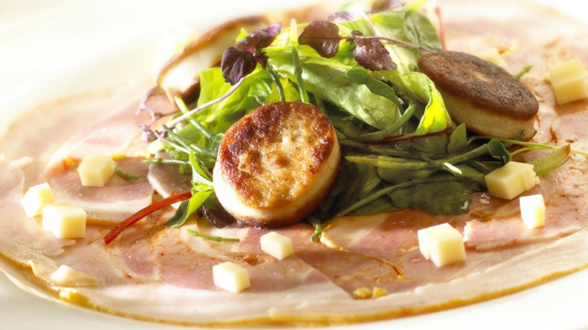 Verdeel de sneetjes kalfsrol over 4 borden. Plaats in het midden wat sla en werk af met de gebakken pens en de stukjes abdijkaas. Sprenkel er nog een beetje van dressing over en serveer.